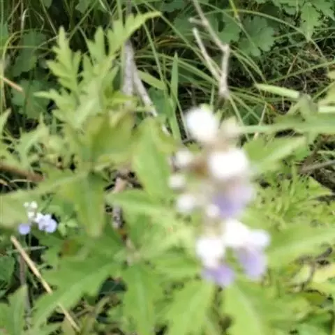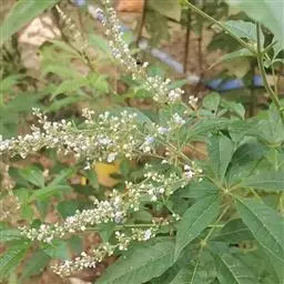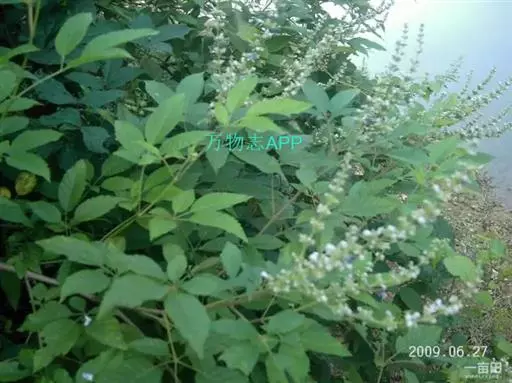 白毛黄荆(Vitex negundoL.f.albaPei),灌木;小枝密生灰白色绒毛。小叶通常3,罕有5;小叶片阔披针形至卵形,全缘或偶有少数锯齿,两面密生灰白色绒毛。花序较紧缩。