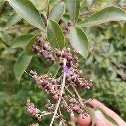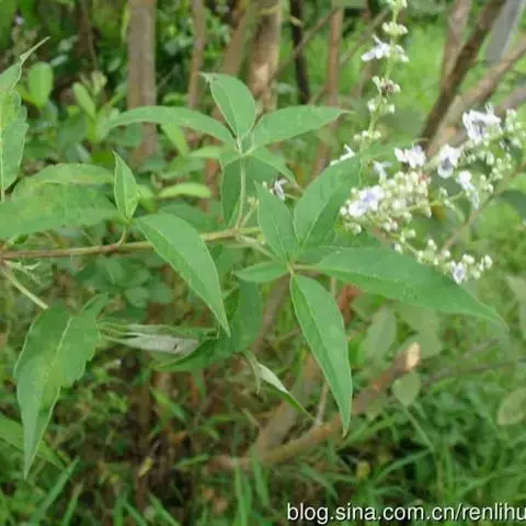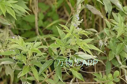小叶荆(Vitexn egundoL.var.microphyllaHand.-Mazz..),灌木。掌状复叶,小叶3-7,通常5;小叶片椭圆状披针形,全缘,顶端渐尖,基部楔形,表面绿色,背面密生灰白色绒毛,中间小叶片长1.5-4厘米,宽0.5-1厘米。花序顶生,长5-11厘米。果实有毛。花果期7-11月。