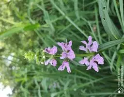 聚伞花序排成圆锥花序式,顶生,长10-27厘米,花序梗密生灰白色绒毛;花萼钟状,顶端有5裂齿,外有灰白色绒毛;花冠淡紫色,外有微柔毛,顶端5裂,二唇形;雄蕊伸出花冠管外;子房近无毛。