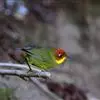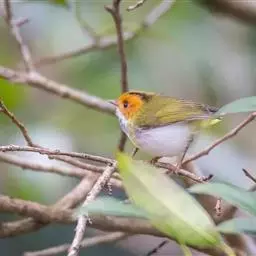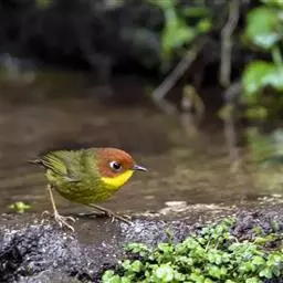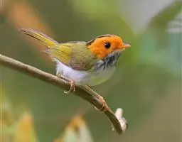棕脸鹟莺:体长10厘米,是一种色彩亮丽而有特色的莺鸟。头栗色,具黑色侧冠纹。上体绿,腰黄色。下体白,…