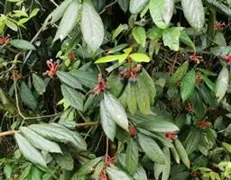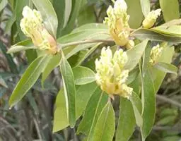 灌木,通常3-5米。枝条褐色,有浅棕色纵裂的皮孔,无毛。叶常生于枝条的梢端,线状披针形,长4-12(16)厘米,宽约1-2.5(3.2)厘米,先端渐尖,基部渐狭成楔形,革质,上面无毛,但不甚光亮,下面暗粉绿色,无毛,或嫩叶有时有贴伏微柔毛,中脉上面平坦,下面明显,侧脉纤细,每边约6-8(11)条,两面不明显或明显,小脉密网状,两面形成蜂巢状浅窝穴;叶柄长7-15毫米。聚伞状圆锥花序多数,生于新枝上端,少分枝,通常长约3厘米,无毛,或总梗和各级序轴、花梗被或疏或密的绢状微毛;花黄色或淡黄色,花梗长2-5毫米;花被筒倒圆锥形;花被裂片长圆形,外轮的略短小,两面被绢状小柔毛,内面的毛较密,雄蕊花丝被柔毛,基部的毛较密,雄蕊第三轮稍长,腺体圆状肾形,连柄长达花丝的1/2,退化雄蕊先端三角状箭头形,柄密被柔毛;子房近球形,花柱纤细,柱头偏头状。果序疏松,少果,生小枝先端,长3.5-7.5厘米,或在热带温暖气侯下,新枝继续生长,开花期常抽出新叶,显出果序生于新枝的下端,有时果序与叶等长,长有达14厘米的;果球形,直径约7-10毫米,嫩时绿色,熟时紫黑色;果梗红色。花期2-3月,果期4-6月。