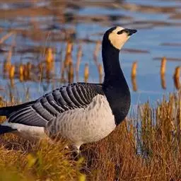 黑雁是雁形目鸭科黑雁属鸟类,又称黑鹅。头、颈、胸、嘴及脚黑褐色;虹膜褐色;背及两翼灰褐色;尾下覆羽白色;胸侧及胁部多近白色纹;颈部两侧各具一个特征性白色横纹,在颈前后断开,未能联成颈环。幼鸟颈部无白斑,而翅上多白色横纹。黑雁繁殖于北美洲、西伯利亚极地的苔原冻土带,越冬于南方沿海的草地及河口。在中国安徽也能见其身影。主要栖息在海湾、海港及河口等地,在冬季里大多出现在有耐碱植物生长的湖泊和水库周围,也出现在周围地势低洼的咸水湖和沿海地区,偶尔还出现在农田地里。性活跃,喜集群,常成群活动和栖息。主要以植物性食物为食。繁殖期在6-8月,雌鸟孵卵,雄鸟通常在距巢100米以内范围内守候警诫。雌鸟孵卵时常将头和颈朝地面平伸出去以降低高度。孵化期为22-28天。黑雁被列入中国林业局2000年8月1日发布的《国家保护的有益的或者有重要经济、科学研究价值的陆生野生动物名