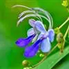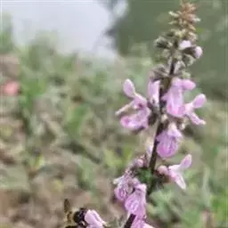 花近无梗,对生,少数聚集在短枝的顶端组成总状花序;苞片小,具柄。花萼卵状钟形,长约4毫米,外面密被白色星状绒毛及腺体,内面无毛,11脉,二唇形,上唇近圆形,全缘或具很短的3齿,下唇2齿,齿卵圆状三角形。花冠蓝紫色,长不及1厘米,外被疏短柔毛,内面无毛,冠筒稍外伸,冠檐二唇形,上唇直伸,2浅裂,裂片卵圆形,下唇宽大,3裂,中裂片最大,内凹,下倾,边缘为齿状,基部缢缩成柄,侧裂片长圆形。