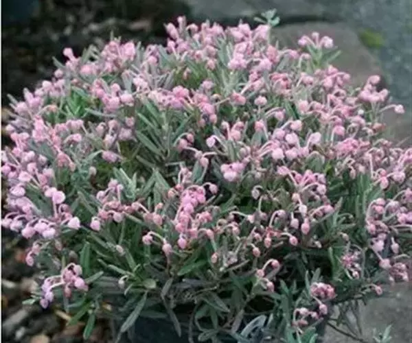 灌木,高达2米。茎及老枝圆柱形,皮层暗灰色,不规则的纵裂,块状剥落,幼枝四棱形,密被白色星状细绒毛。叶常常在枝上丛生,具极短的柄或无柄,叶片线形,长1-2.5厘米,宽1-2毫米,先端钝,基部渐狭,全缘,向背面卷曲,革质,上面稍具光泽,近无毛,下面密被白色的星状绒毛。