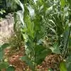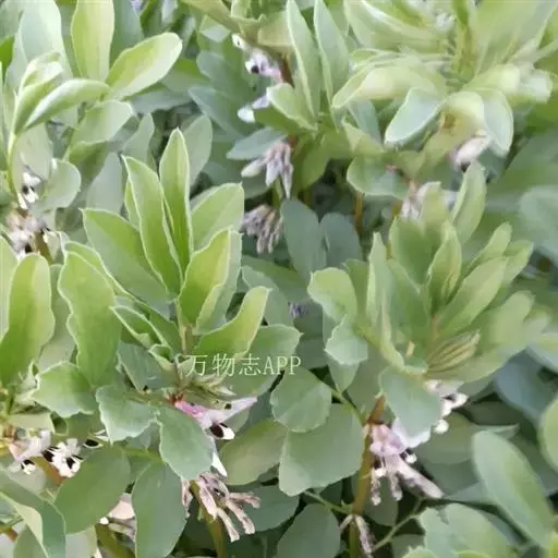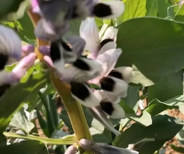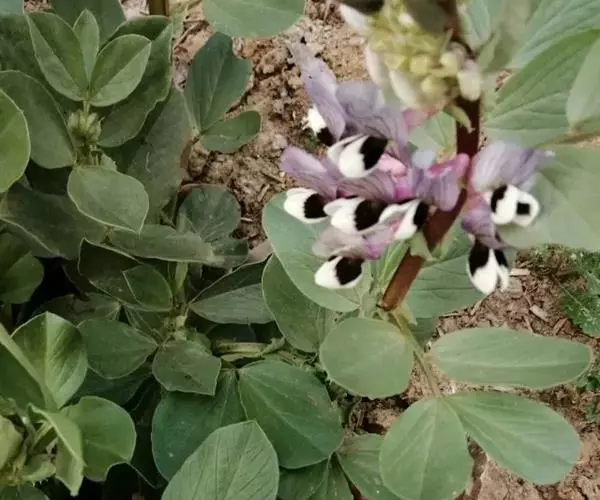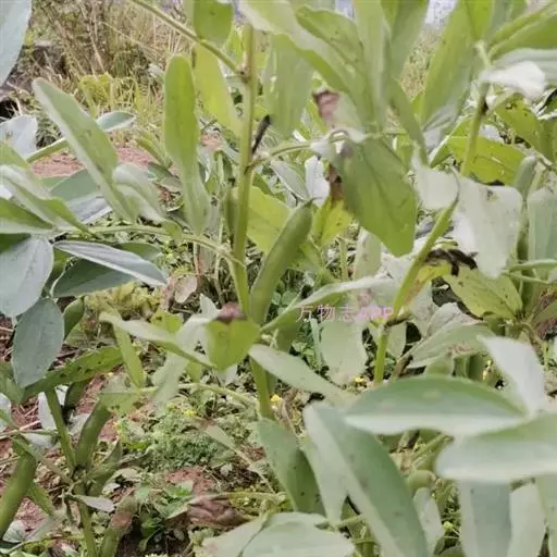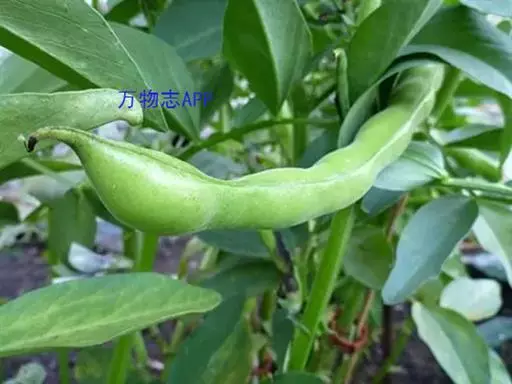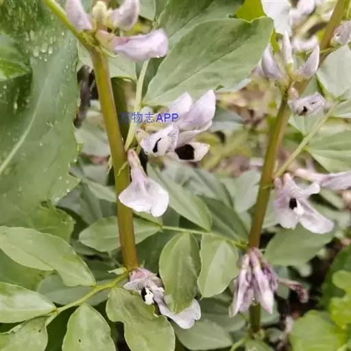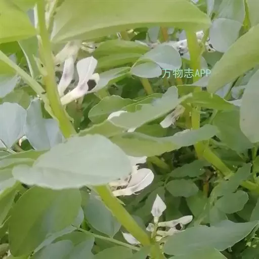 蚕豆(学名:Vicia faba L.):豆科一年生草本,高30-100厘米。主根短粗,多须根,根瘤粉红色,密集。茎粗壮,直立,具四棱,中空、无毛。偶数羽状复叶,叶轴顶端卷须短缩为短尖头;托叶戟头形或近三角状卵形,略有锯齿,具深紫色密腺点;小叶通常两面均无毛。总状花序腋生,花梗近无;花萼钟形,萼齿披针形,下萼齿较长;具花2-4(6) 朵呈丛状着生于叶腋,花冠白色;花柱密被白柔毛。荚果肥厚,成熟后表皮变为黑色。种子长方圆形,近长方形,中间内凹,种皮革质,青绿色,灰绿色至棕褐色,稀紫色或黑色;种脐线形,黑色。花期4-5月,果期5-6月。