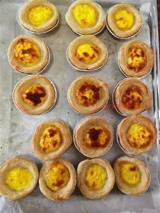 第八步,装入烤盘,放入预热好的烤箱烤焙,200-210℃左右,25分钟左右,烤至蛋挞水表面出现焦点点即可。