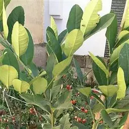 常绿灌木或小乔木。叶椭圆形,两端尖。果扁圆形,朱红色;味甜,可食。产自中国东南部,广东地区大量盆栽。