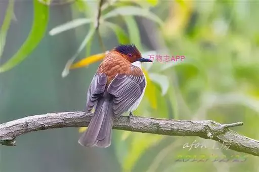栗背短脚鹎,体长18-22厘米。上体栗褐,头顶和羽冠黑色。背栗色、翅和尾暗褐色具白色或灰白色羽缘。…