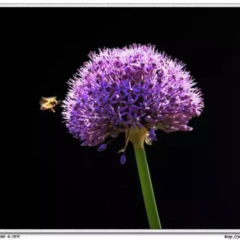 花葶粗壮,高可达1m,中空的圆筒状,在中部以下膨大,向上渐狭,下部被叶鞘;总苞2-3裂;伞形花序球状,具多而密集的花;小花梗长约2.5cm。花粉白色;花被片具绿色中脉,矩圆状卵形,长4-5mm,宽约2mm;花丝等长,稍长于花被片,约在基部1/5处合生,合生部分下部的1/2与花被片贴生,内轮花丝的基部极为扩大,扩大部分每侧各具1齿,外轮的锥形; 子房:近球状,腹缝线基部具有帘的凹陷蜜穴;花柱长约4mm。花果期5-7月。 [3-4]