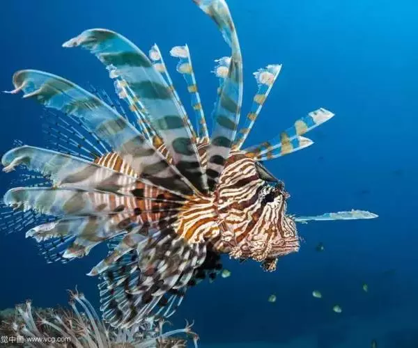 只有在求偶交配期,斑鳍蓑鲉才会和其他同类有所接触。在这种情 斑鳍蓑鲉 况下,一条雄鱼会被多条雌鱼追求,数条鱼一起行动,形成一个有3-8条鱼的鱼群。