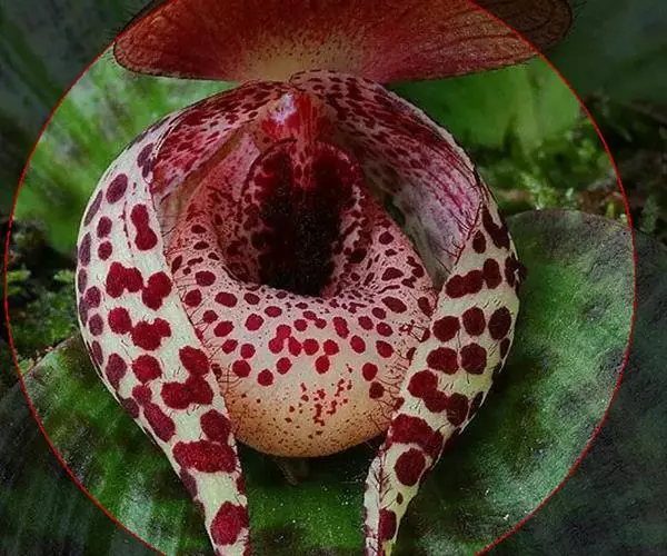 花序顶生,具1花;花序柄长4-7厘米,无毛;花苞片不存在;子房长1.2-1.8厘米,通常弯曲,无毛;花甚美丽,较大;萼片暗黄色而有浓密的红肝色斑点或完全红肝色,花瓣与唇瓣暗黄色而有略疏的红肝色斑点;中萼片卵形或宽卵形,长4.2-7厘米,宽3.8-6厘米,先端急尖,边缘有缘毛;合萼片椭圆形,长3.5-5.6厘米,宽2-3.6厘米,先端略有2齿,边缘亦有缘毛。