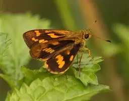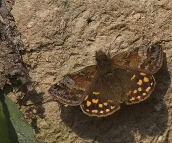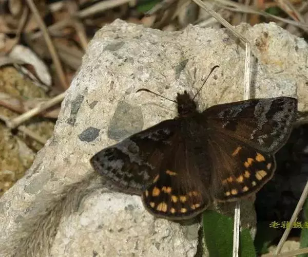 翅暗褐色,雄蝶有紫色光泽。前翅外半部有深灰色波状横带,其前缘有模糊白色点列;后翅面有2行黄色斑列(其内列斑纹较大,排列不规则),中室端斑1个。雌蝶前翅面波状带色淡,宽而明显(尤其中带特别宽而色淡)。