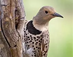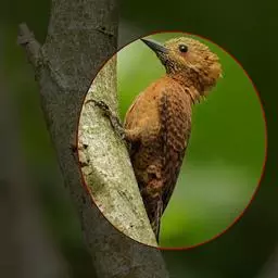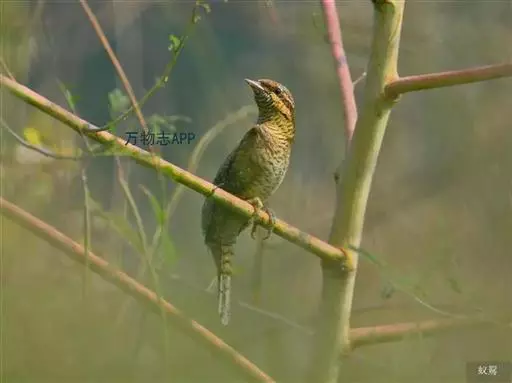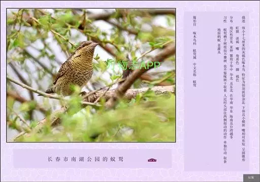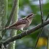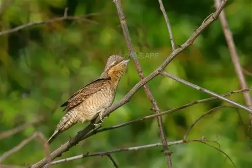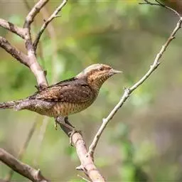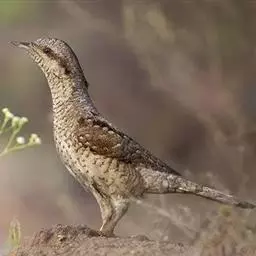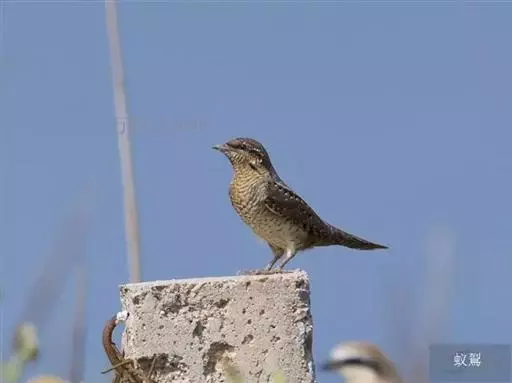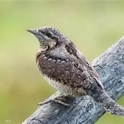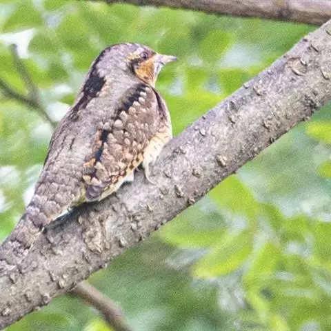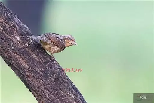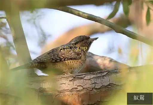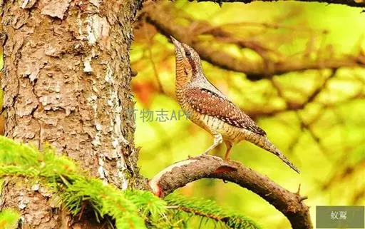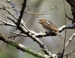 蚁䴕(学名:Jynx torquilla):又名欧亚蚁䴕,䴕形目啄木鸟科蚁䴕属小型鸟类,有6亚种。全长约17厘米。全身体羽黑褐色,斑驳杂乱,上体及尾棕褐色,自后枕至下背有一暗黑色菱形斑块;下体具有细小横斑,就啄木鸟而言,尾较长,有数条黑褐色横斑。栖息于低山丘陵和山脚平原的阔叶林或混交林的树木上。喜欢单独活动。受惊时颈部像蛇一样扭转,俗称“歪脖”。取食蚂蚁,舌长,具钩端及黏液,可伸入树洞或蚁巢中取食。在旧的啄木鸟洞穴中营巢,每窝产卵5-14枚,约12-14天出雏。