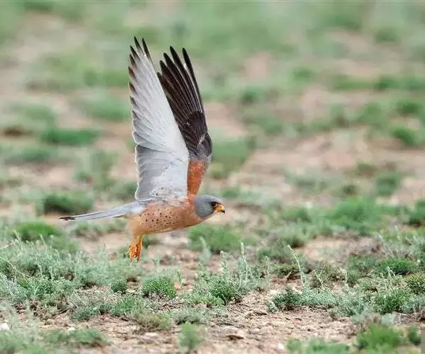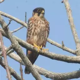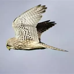 黄爪隼(学名:Falco naumanni):体长29-32厘米,体重124-225克。雌雄鸟异色。雄鸟头、颈和翅上覆羽铅灰色;尾羽淡蓝色,具宽阔黑色次端班和近白色端斑。雌鸟前额为污白色,具纤细的黑色羽干纹;眼上有一条白色眉纹;头、颈、肩、背及翅上覆羽棕黄色或淡栗色,具9-10道黑色横斑和宽的黑色次端斑及白色端斑。幼鸟和雌鸟相似,但上体纵纹和横斑粗著,腰和尾上覆飞淡棕色;中央尾羽蓝灰色,仅具宽阔的黑色次端斑;外侧尾羽棕色,具黑褐色横斑。虹膜暗褐色,嘴蓝灰色,跗和趾淡黄色,爪淡白色。
