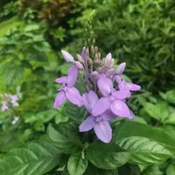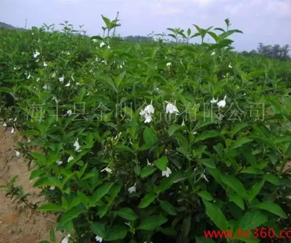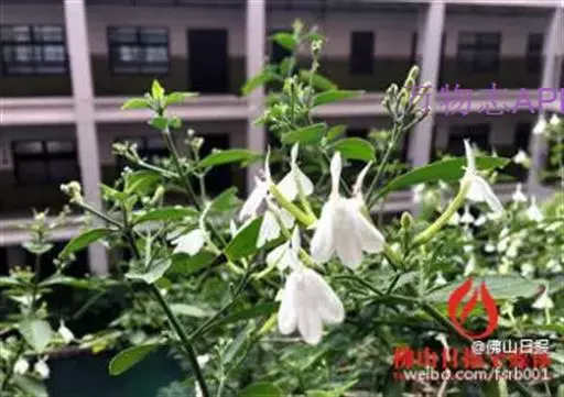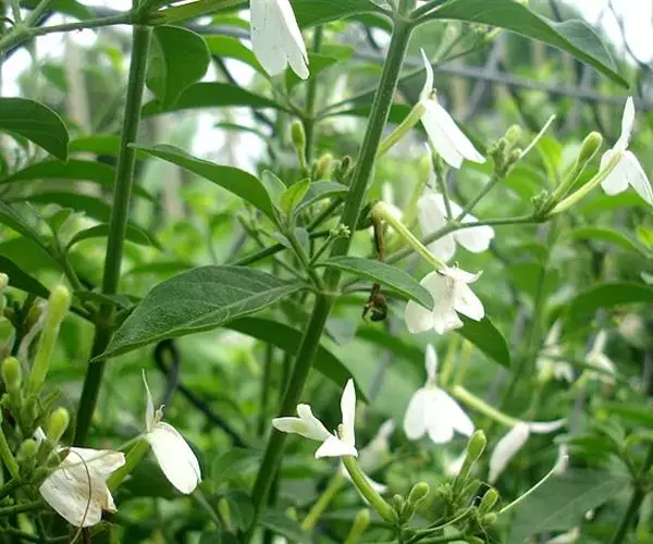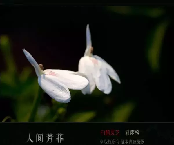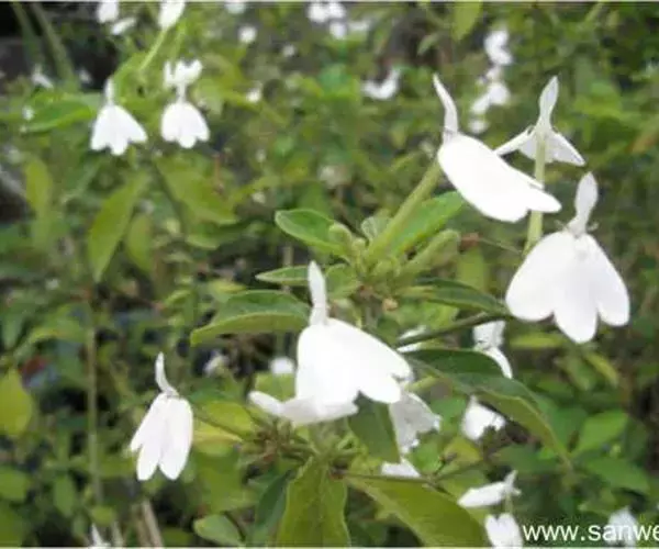 聚繖花序,著生于枝梢或叶腋,苞片细小,花萼裂片为五,条状披针形,两面生腺毛,唇形花冠白色,上唇披针状,下唇短三裂,花冠形状,在一片绿意背景中犹如一只只展翅飞翔的白鹤;可育雄蕊2枚,花药两室。