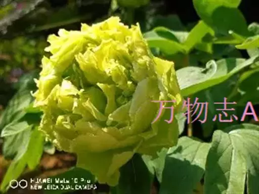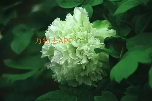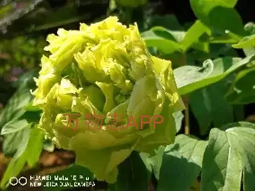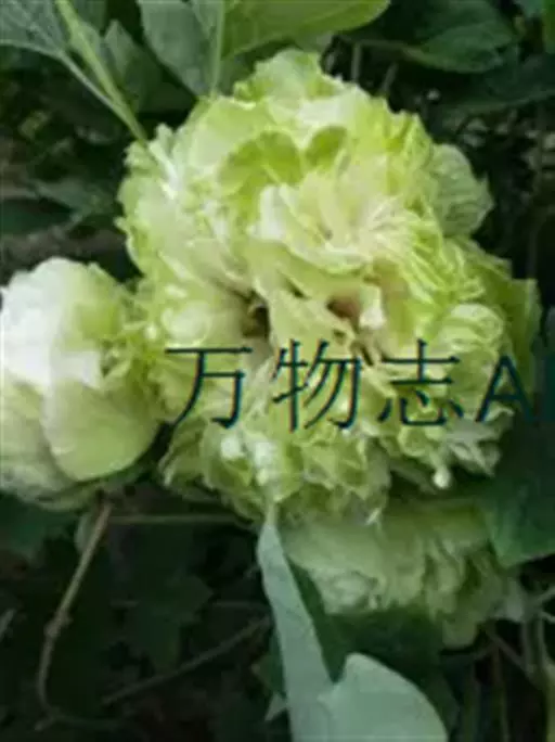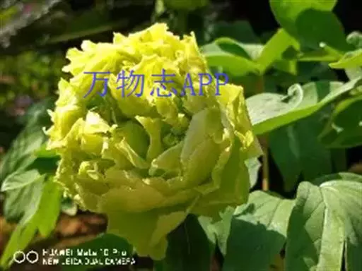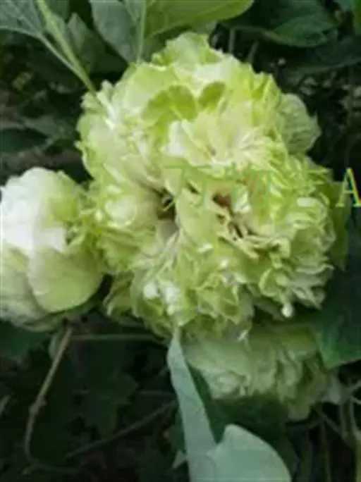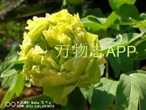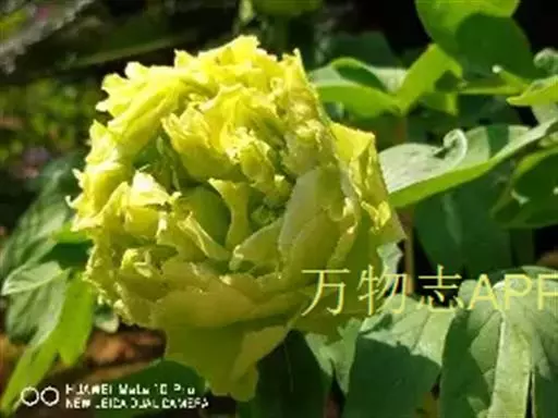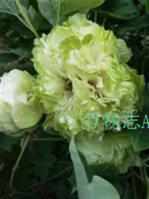 豆绿(学名:Paeonia suffruticosa 'Pea Green'):牡丹四大名品之一。落叶灌木。茎高达2米;分枝短而粗。叶通常为二回三出复叶,顶生小叶宽卵形,表面绿色,无毛,背面淡绿色,有时具白粉,沿叶脉疏生短柔毛或近无毛。花单生枝顶,苞片5,长椭圆形,大小不等;萼片5,绿色,宽卵形,大小不等;花为重瓣,皇冠型或绣球型。花蕾圆形,顶端常开裂;花黄绿色,顶端呈不规则的波状;花丝上部白色,花药长圆形,花盘革质,杯状,紫红色;心皮5,密生柔毛。蓇葖长圆形,密生黄褐色硬毛。花期5月;果期6月。