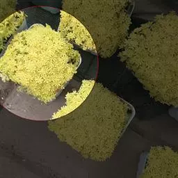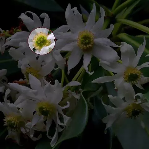 花朵皇冠型或绣球型。花蕾圆形,顶端常开裂,花黄绿色(144-D);花径12×6厘米。外瓣2-3轮,质厚而硬,基部具紫色斑,内瓣密集,皱褶;雌蕊瓣化或退化。花梗细软,花朵下垂。晚花品种。株型较矮,开展。枝较细,一年生枝短,节间较短;鳞芽狭尖形,形似鹰嘴,浅褐绿色,鳞片顶尖红色。生长势中,成花率高,萌蘖枝多。