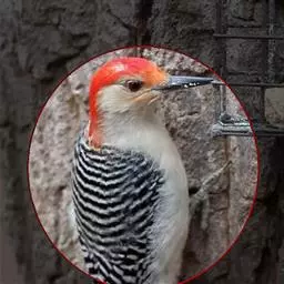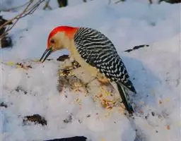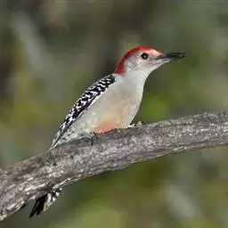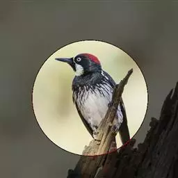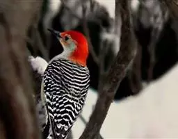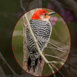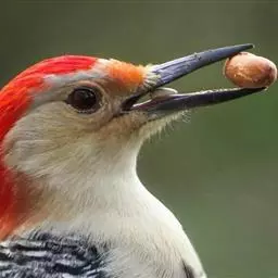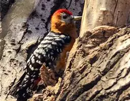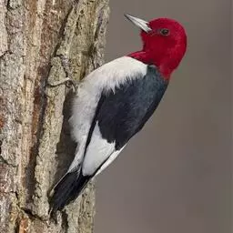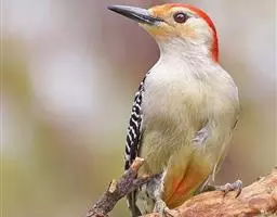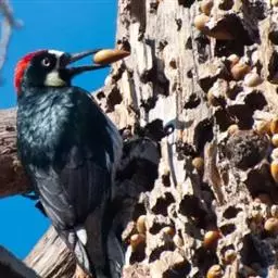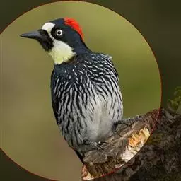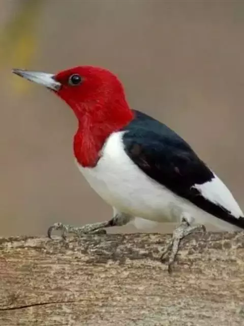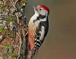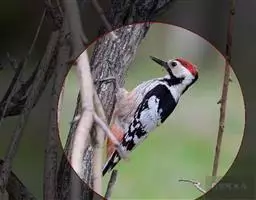 橡树啄木鸟:体长20-23厘米。前额灰黄色,头顶、后颈红色。喉下部、腰和腹部白色,…