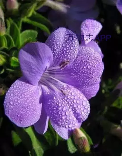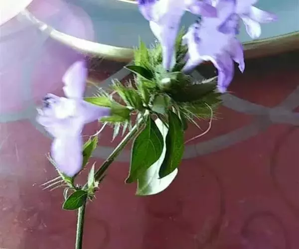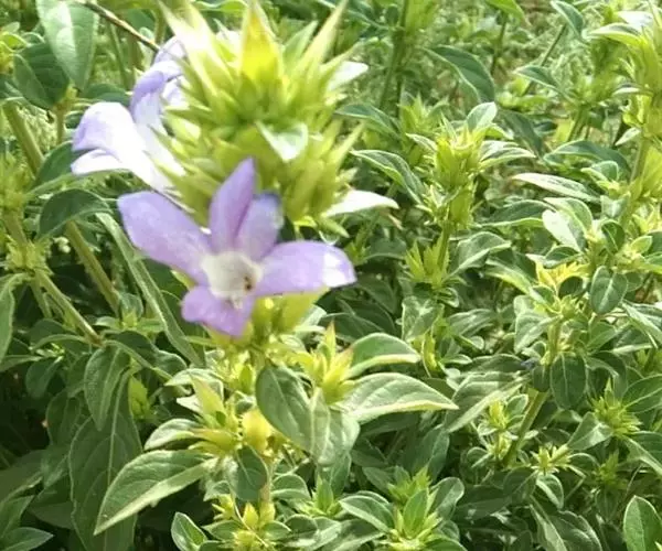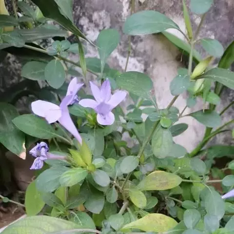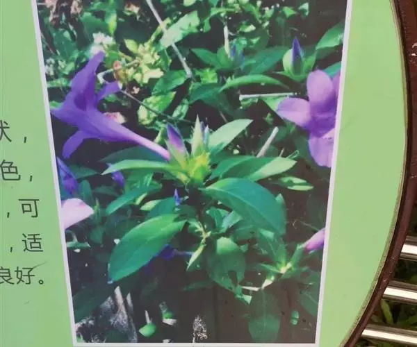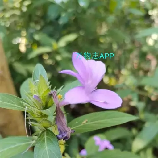 有时花退化而只有2枚不孕的小苞片;外2萼片卵形至披针形,长1.2-2厘米,前萼片较后萼片稍短,先端急尖具刺尖,基部圆,边缘有小点,齿端具刺尖,脉纹甚显著,内2萼片线形或披针形,长6-7毫米,1脉,有缘毛,花冠蓝紫色或白色,2唇形,通常长3.5-5厘米,有时可长达7.5毫米,花冠管圆筒状,喉部渐大,冠檐5裂,裂片近相等,长圆形;能育雄蕊4,2长2短,着生于喉基部,长雄蕊花药2室并生,短雄蕊花药顶端相连,下面叉开,不育雄蕊1,所有花丝均被疏柔毛,向下部较密;子房扁,长椭圆形,无毛,花盘杯状,包被子房下部,花柱线状无毛,柱头略膨大。蒴果长圆形,长1.2-1.8厘米,两端急尖,无毛。花期11-12月。