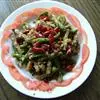 11:上碟前,将准备好的肉碎倒入再炒几下就用大火炒收汁(可放豉油),最后放中葱段,就可以上碟了。