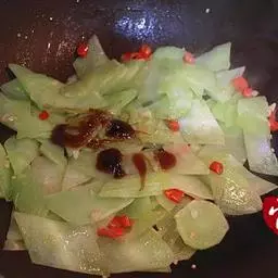 4,、放入青椒后便倒入事先调好的鱼香酱汁调料翻炒片刻,临出锅前放入蒜末。