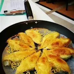 6:这一款粤式的特点就是外层酥爽,里层滑软,所以要第二次炸茄条,大火再炸一次茄条,目的是把茄内 的油都逼出来,同时让茄身更香口而不腻,炸好后捞起放一旁备用,也让油份再次流走。