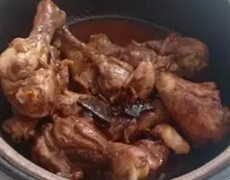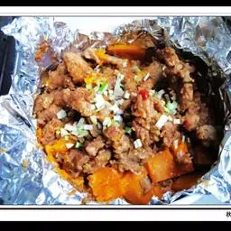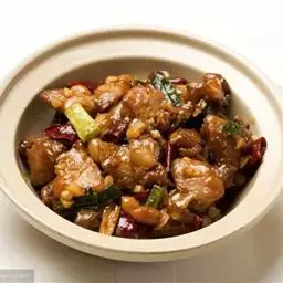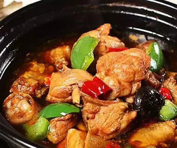 ③趁锅内余油,下蒜茸、芹菜粒、椒粒、堡仔酱爆香,接着下鸡粒炒匀,加入绍酒、上汤及茄瓜条和以上味料和炸香咸鱼茸,略焖片刻,调入少许生粉,加入包尾油。转盛入瓦煲里,加热至滚,下香油、葱花, 加盖上桌即可。