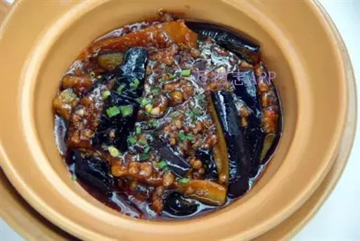 6:放入砂锅,把茄子和肉碎放入砂锅内,盖上中火盖子焖5分钟,面放葱花。