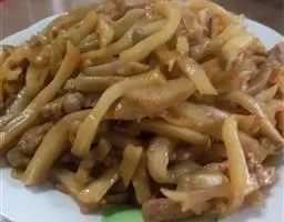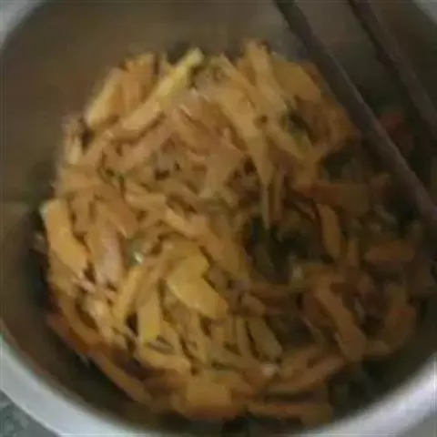 4:锅放花生油,不能太少油(会粘锅),把腌好的肉碎入锅中火慢放少许豉油炒熟,备用。