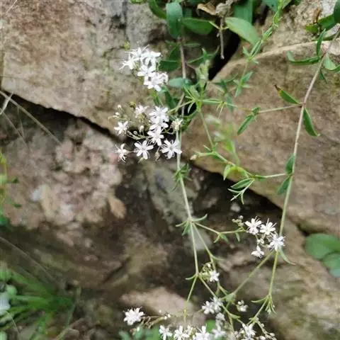 别名锥花丝石竹、满天星。石竹科丝石竹属一年生草本植物。茎纤细,多分枝而开展,节处膨大。单叶对生,狭披针形至线状披针形,全缘。小花繁多,组成疏散的圆锥花序,花白色,花瓣5枚,长椭圆形;萼短钟状,5裂;花期5~6月。蒴果球形。