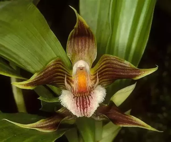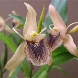 贝母兰根状茎较坚硬,多分枝,粗4-6毫米,密被有光泽的、革质的、鳞片状鞘。假鳞茎在根状茎上相距1.5-3厘米,长圆形或卵形,长(1-)2.5-6厘米,粗(0.5-)1-1.7厘米,干后皱缩而有深槽,顶端生2枚叶,基部具数枚鞘;鞘革质,卵形或卵状披针形,长2-6厘米。叶线状披针形,坚纸质,长(5-)10-17厘米,宽(4-)7-19毫米,先端长渐尖,基部渐狭,具不明显的短柄。