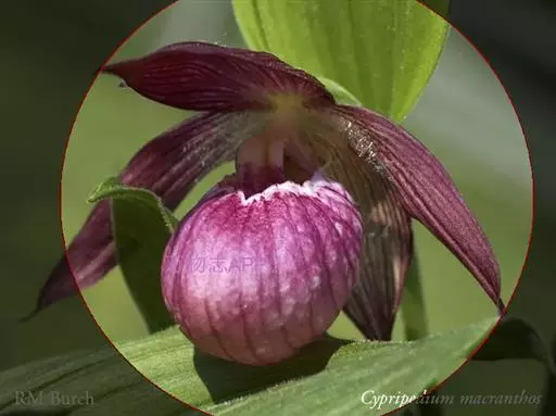 大花杓兰(学名:Cypripedium macranthum Sw.):植株高25-50厘米,具粗短的根状茎。茎直立,稍被短柔毛或变无毛,基部具数枚鞘,鞘上方具3-4枚叶。叶片椭圆形或椭圆状卵形。花序顶生,具1花,花大,紫色、红色或粉红色,通常有暗色脉纹,极罕白色;花瓣披针形,长4.5-6厘米,宽1.5-2.5厘米,先端渐尖,不扭转,内表面基部具长柔毛;唇瓣深囊状,近球形或椭圆形。蒴果狭椭圆形,长约4厘米,无毛。花期6-7月,果期8-9月。