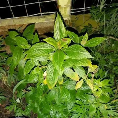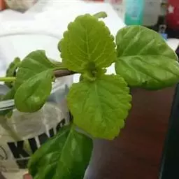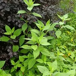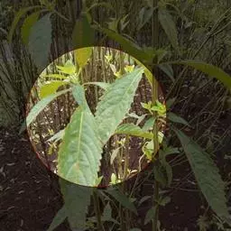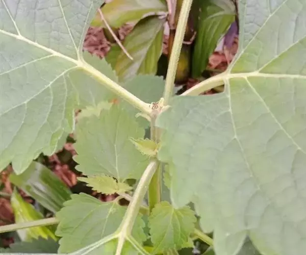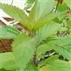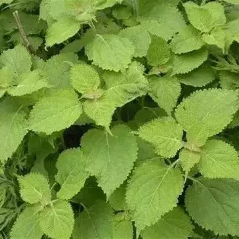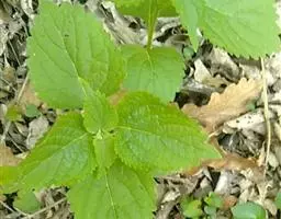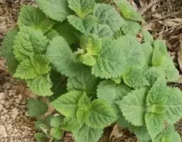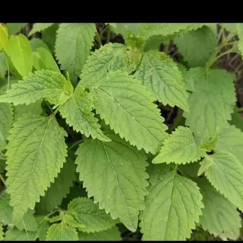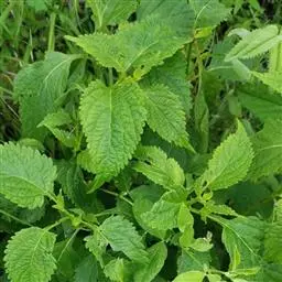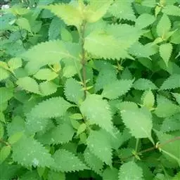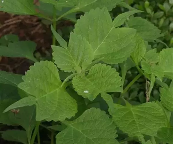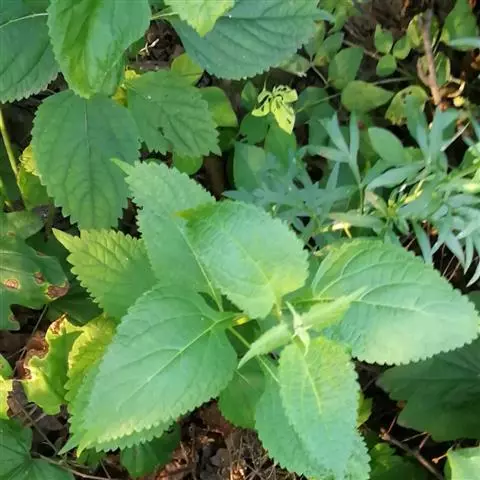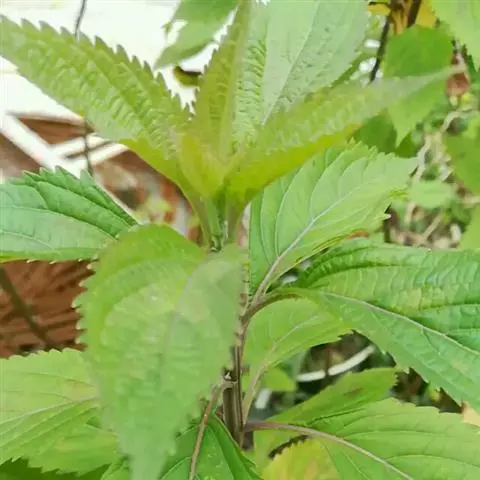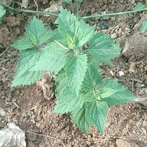 茎叶对生,圆形或圆状卵圆形,长(4)6-13厘米,宽3(4)-10厘米,先端具深凹,凹缺中有一尾状长尖的顶齿,顶齿长4-6厘米,基部渐狭至中肋,全缘或下部有1-2对粗锯齿,叶片基部宽楔形或近截形,骤然渐狭下延至叶柄,边缘在基部以上具粗大的牙齿状锯齿,齿尖具胼胝体,上面暗绿色,沿脉上密被微柔毛,余部散布糙伏毛伏小硬毛,下面淡绿色,沿脉上疏被微柔毛,余部无毛,散布淡黄色腺点,侧脉3-4对,两面隆起,平行细脉明显;叶柄长0.6-6厘米,向茎顶变短,腹凹背凸,疏被微柔毛,上部具翅。