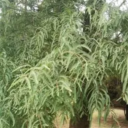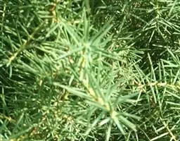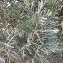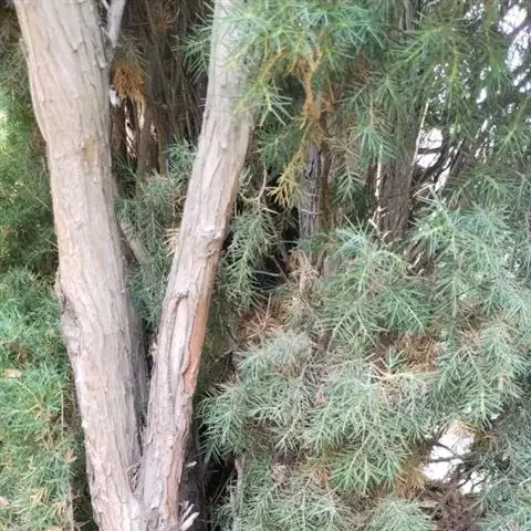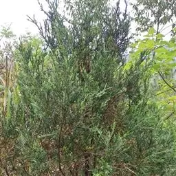 高山柏 灌木,高1-3米,或成匍匐状,或为乔木,高5-10余米,稀高达16米或更高,胸径可达1米;树皮褐灰色;枝条斜伸或平展,枝皮暗褐色或微带紫色或黄色,裂成不规则薄片脱落;小枝直或弧状弯曲,下垂或伸展。叶全为刺形,三叶交叉轮生,披针形或窄披针形,基部下延生长,通常斜伸或平展、下延部分露出,稀近直伸、下延部分不露出,长5-10毫米,宽1-1.3毫米,直或微曲,先端具急尖或渐尖的刺状尖头,上面稍凹,具白粉带,绿色中脉不明显,或有时较明显,下面拱凸具钝纵脊,沿脊有细槽或下部有细槽。雄球花卵圆形,长3-4毫米,雄蕊4-7对。