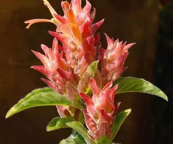 多年生直立草本,全体被白色柔毛。茎通常丛生,不分枝,高20-30厘米。叶最下部的对生,其余的互生,长条形至条状披针形,长2-8厘米,宽0.2-0.5厘米,全缘,基出三大脉。花序长3-12厘米;苞片卵状披针形,黄白色,长1-3厘米,宽0.5-1.2厘米;花萼长约2厘米,前后两方裂达一半,两侧裂达1/4,裂片条形;花冠淡黄色或白色,长2.5-3厘米,筒部长管状;药室一长一短。蒴果无毛,长约1厘米,顶端钩状尾尖。花期6-8月。 火焰草