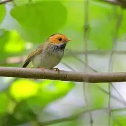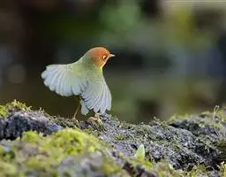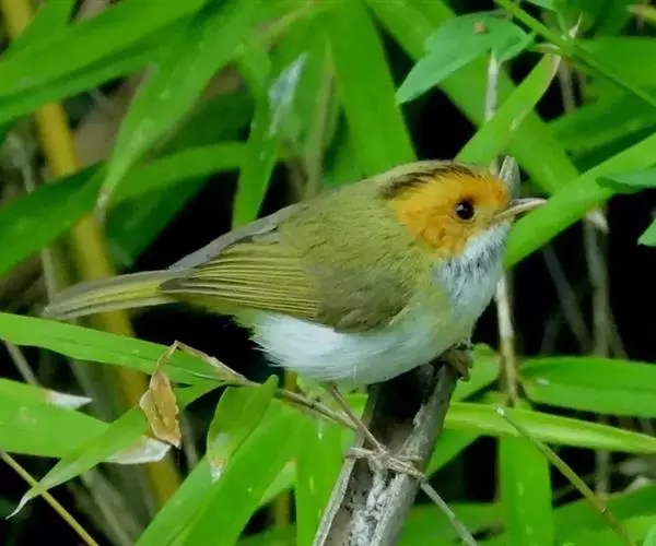 棕脸鹟莺:体长10厘米,是一种色彩亮丽而有特色的莺鸟。头栗色,具黑色侧冠纹。上体绿,腰黄色。下体白,…