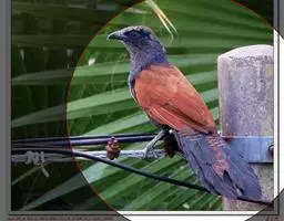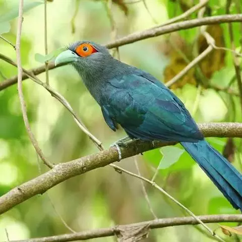 绿嘴地鹃:体形似小鸦鹃,但羽色大致绿灰;嘴绿色,头侧眼的周围有一裸区;后爪弯曲。虹膜赤红色,…