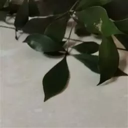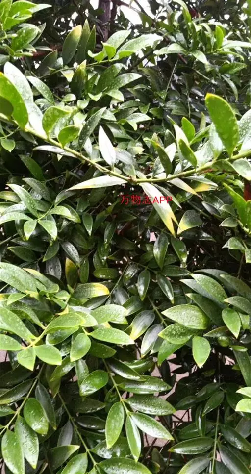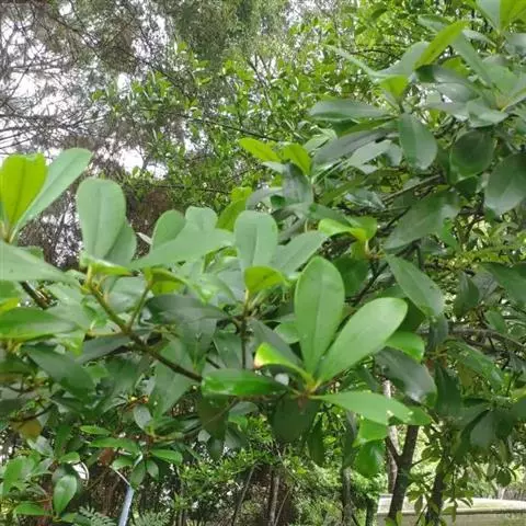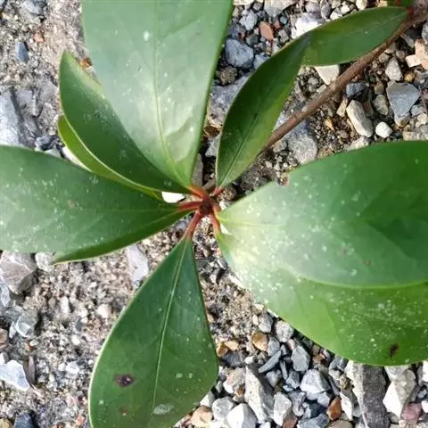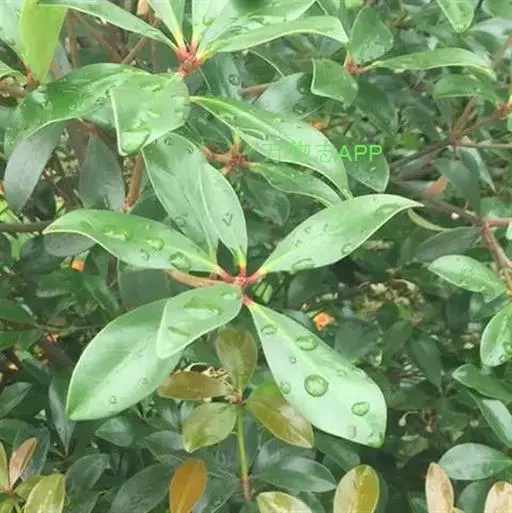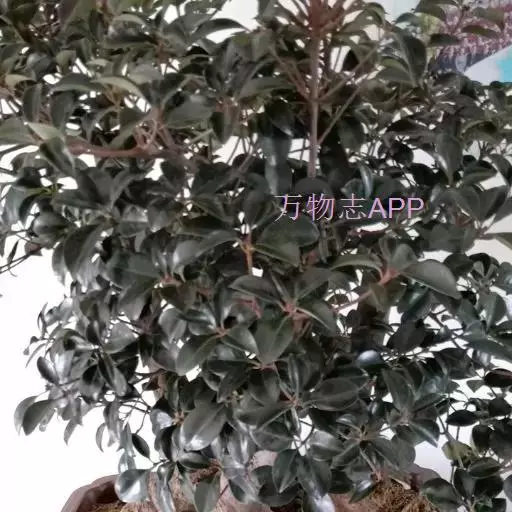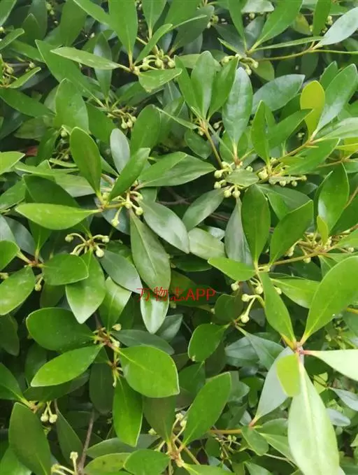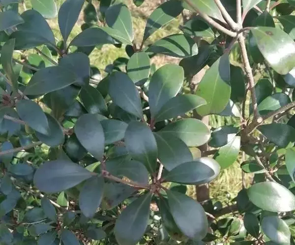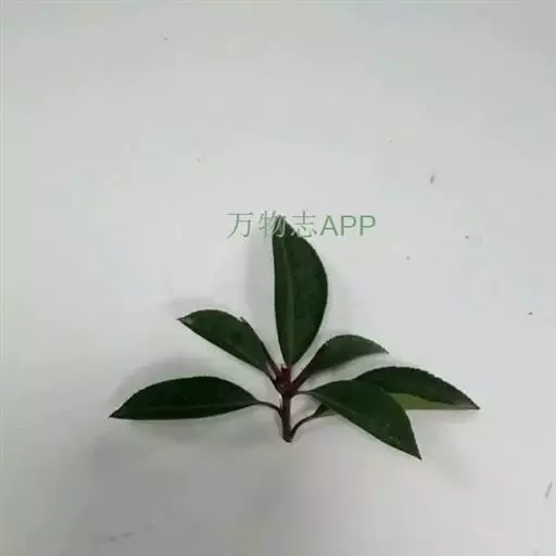 叶革质或薄革质,通常聚生于枝端,互生,叶片椭圆形、椭圆状倒卵形至长圆状倒卵形,长5.5-9厘米,宽2-3.5厘米,顶端短渐尖或急窄缩成短尖,尖头钝,基部楔形,边全缘,稀有上半部疏生浅疏齿,齿尖具黑色小点,上面深绿色或绿色,有光泽,下面浅绿色,干后常呈淡红褐色,中脉在上面稍凹下,在下面隆起,侧脉5-6对,两面均不明显,少有在上面隐约可见;叶柄长7-13毫米。