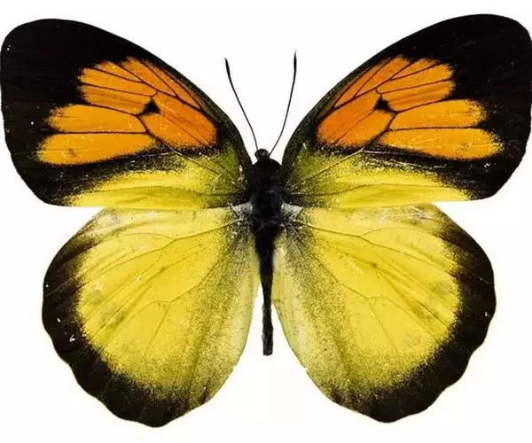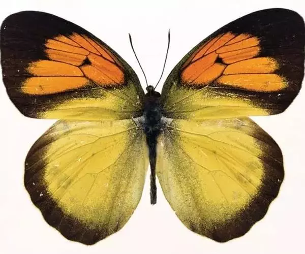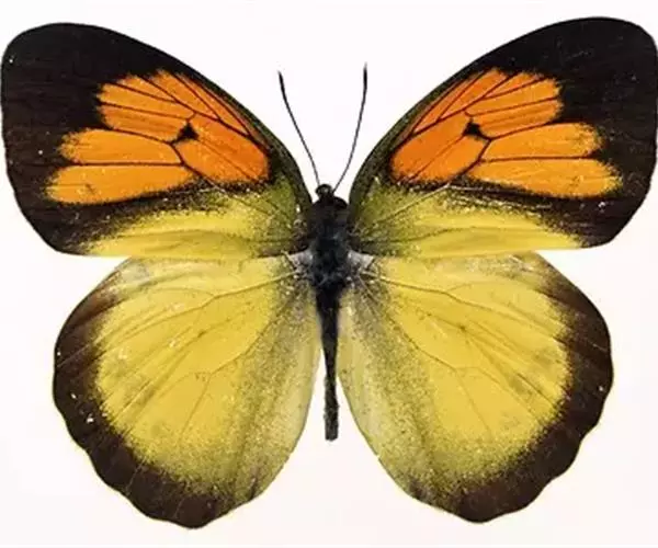 雌雄异型。雄蝶有2种形态,一种前翅正面端半部黑色,基半部为黄色,中域为大型橙色斑,中室端有黑斑,后翅黄色,外线黑带窄;另一种中室端为橙黄色斜带。
