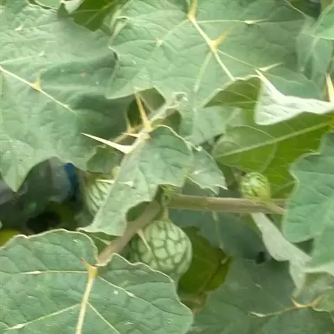 乳茄,茄科茄属直立草本植物,覆盖短的柔毛和扁平尖刺,小枝覆盖长柔毛和扁平刺,刺为蜡黄色,…