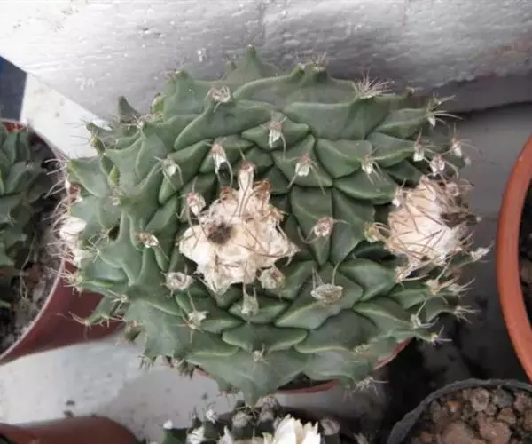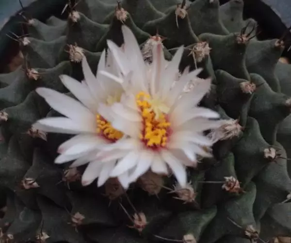 帝冠植株单生,属小型种,根粗大,变态茎形如陀螺,瘤状突起呈三角形,坚硬,呈几何形有序排列,非常特殊,是仙人掌植物中的代表种;盆栽帝冠可点缀窗台、书桌和案头,作为小摆设,是很难得的仙人掌类珍品。