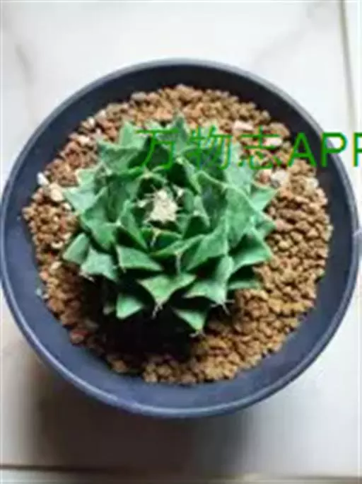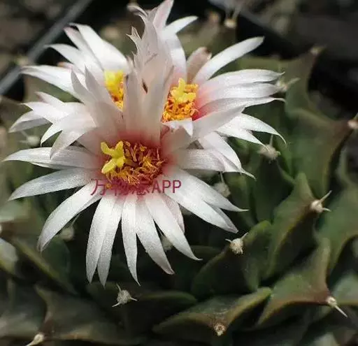 灰绿色三角形叶状疣突在茎部螺旋排列成莲座状,疣突背面有龙骨突。疣基部宽1.5~2.5cm,长1~1.5cm,肉质坚硬,刺座在疣突顶端,新刺座上有短绵毛,一般刺座长有刺2~4枚,刺较小,长1~1.5cm,刺细针状稍内弯,黄白色,早落。老株刺更易脱落,球体下部的疣状突起也易枯萎或脱落,形成树皮状的皱纹。花顶生,短漏斗状,花