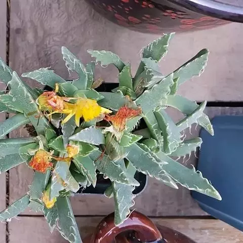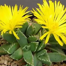 植株密集丛生,非常肉质,叶十字交互对生,基部联合,先端三角形 四海波 ,叶缘和叶背龙骨突表皮硬膜化,大部分叶面有肉齿,叶缘有肉质粗纤毛,花大无柄,花色以黄色为多,夏季休眠。