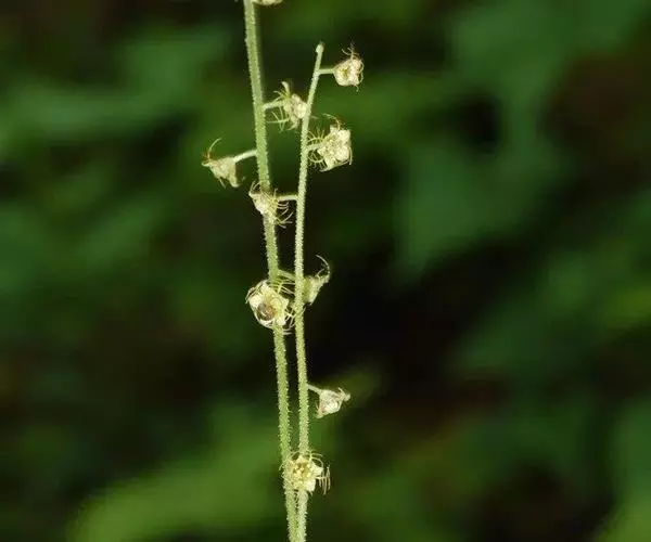总状花序长2-11厘米,疏生数花;花梗长3-5毫米,被短腺毛;萼片近卵形,长1.6-2毫米,先端稍渐尖,单脉;花瓣长约4毫米,羽状9深裂,裂片通常线形;雄蕊10,较萼片短;2心皮大部合生,子房半下位,阔卵球形,花柱2,柱头2裂。