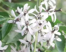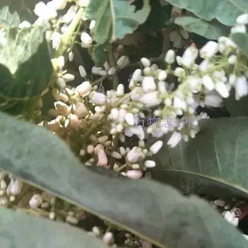 圆锥花序与叶等长或更长,被稀疏的锈色短柔毛或有时近无毛,小聚伞花序生于短的小枝上,多花;花长4-5毫米,具短花梗;花萼5齿裂或浅波状,外面被柔毛,且有睫毛;花瓣5,白色,长圆形,先端钝,长4-5毫米,宽2-3毫米,无毛;雄蕊10,其中5枚能育,5枚退化;花盘无毛,近念珠状;子房圆锥形,有5条细沟纹,无毛,每室有胚珠8颗,花柱比子房长,柱头盘状。