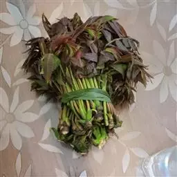 香椿芽在合适的温度条件下(白天18℃~24℃、晚上12℃~14℃),生长快,呈紫红色,香味浓。温室加盖草苫后40~50天,当香椿芽长到15~20厘米,而且着色良好时开始采收。第一茬椿芽要摘取丛生在芽薹上的顶芽,采摘时要稍留芽薹而把顶芽采下,让留下的芽薹基部继续分生叶片。采收宜在早晚进行。温室里香椿芽每隔7~10天可采1次,共采4~5次,每次采芽后要追肥浇水。