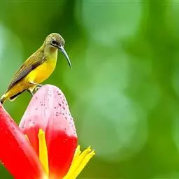太阳鸟有细长微弯的嘴和管状的长舌,和蜂鸟一样以吸食花蜜为生。但遇到小甲虫和蜘蛛,也不放过开荤的机会,抓来充饥。它还是带翅膀的“月下老人”,为植物传授花粉。