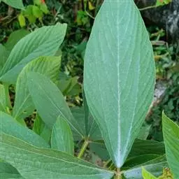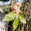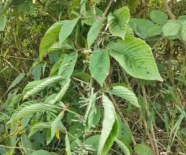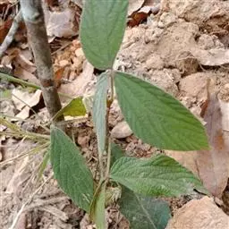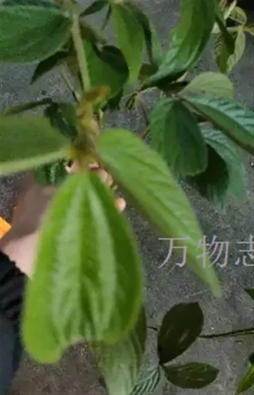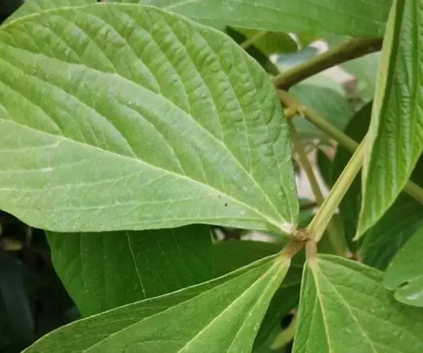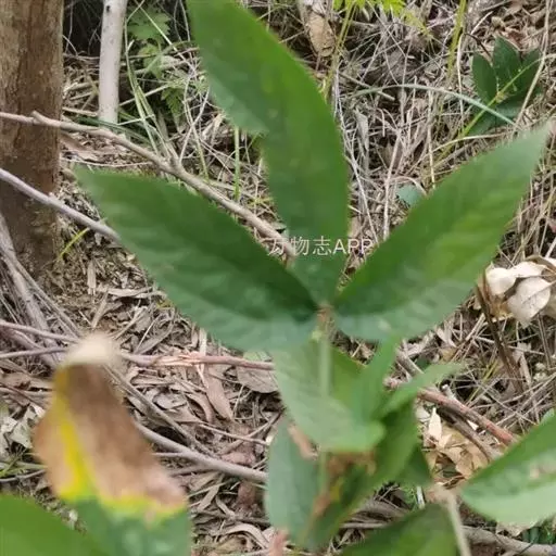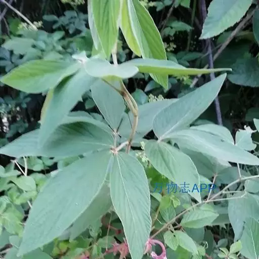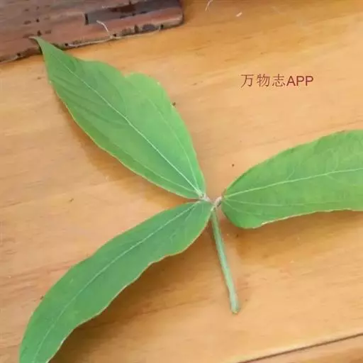 叶具指状3小叶:托叶大,披针形,长可达2厘米,先端长尖,被短柔毛,具腺纹,常早落;叶柄长3-6厘米,具狭翅,被毛与幼枝同;小叶纸质或薄革质,顶生小叶宽披针形至椭圆形,长8-15厘米,宽4-7厘米,先端渐尖,基部楔形;基出脉3,两面除沿脉上被紧贴的柔毛外,通常无毛,下面被黑褐色小腺点,侧生小叶稍小,偏斜,基部一侧圆形,另一侧楔形;基出脉2-3;小叶柄长2-5毫米,密被毛。