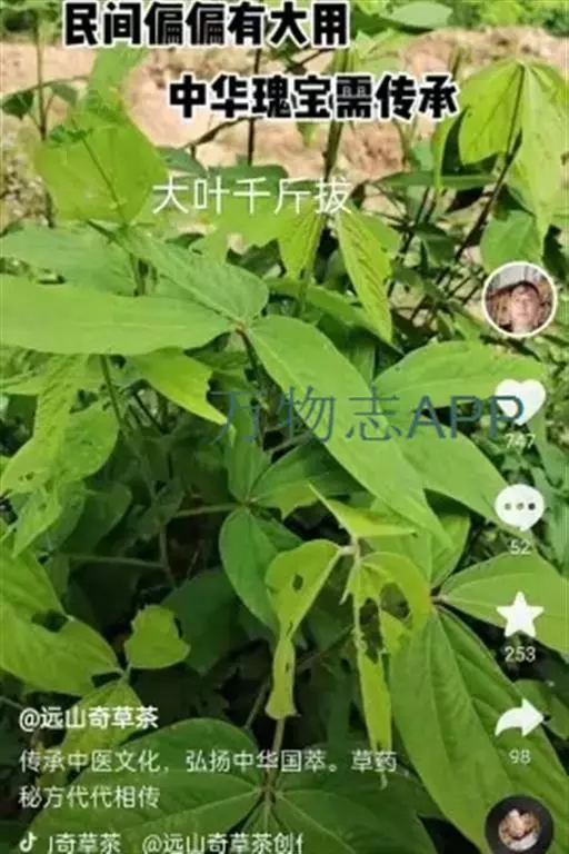 该种根供药用,能祛风活血,强腰壮骨,治风湿骨痛。大叶千斤拔具有速生,耐痔薄干旱、产紫胶性能好,在中国紫胶产区推广种植。