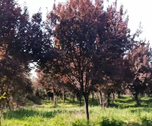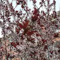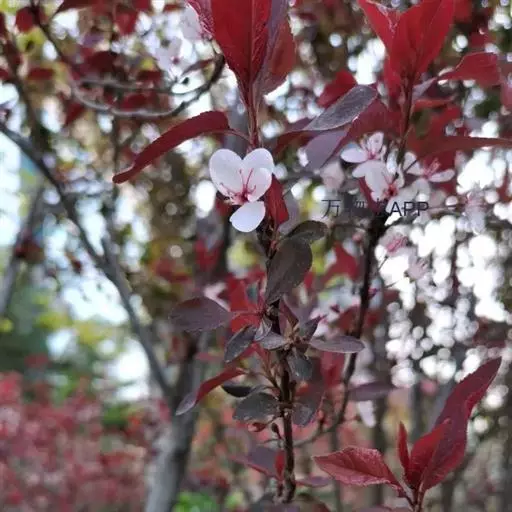 紫叶李,别名:红叶李,蔷薇科李属落叶小乔木,高可达8米,原产亚洲西南部,中国华北及其以南地区广为种植。叶常年紫红色,著名观叶树种,孤植群植皆宜,能衬托背景。尤其是紫色发亮的叶子,在绿叶丛中,像一株株永不败的花朵,在青山绿水中形成一道靓丽的风景线。